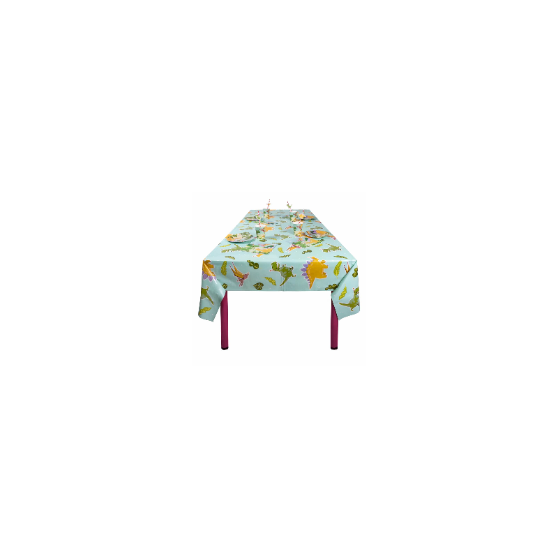 Conçue avec des motifs de dinosaures vibrants sur un fond bleu clair, elle est parfaite pour les anniversaires d’enfants, les piques-niques ou toute célébration thématique.